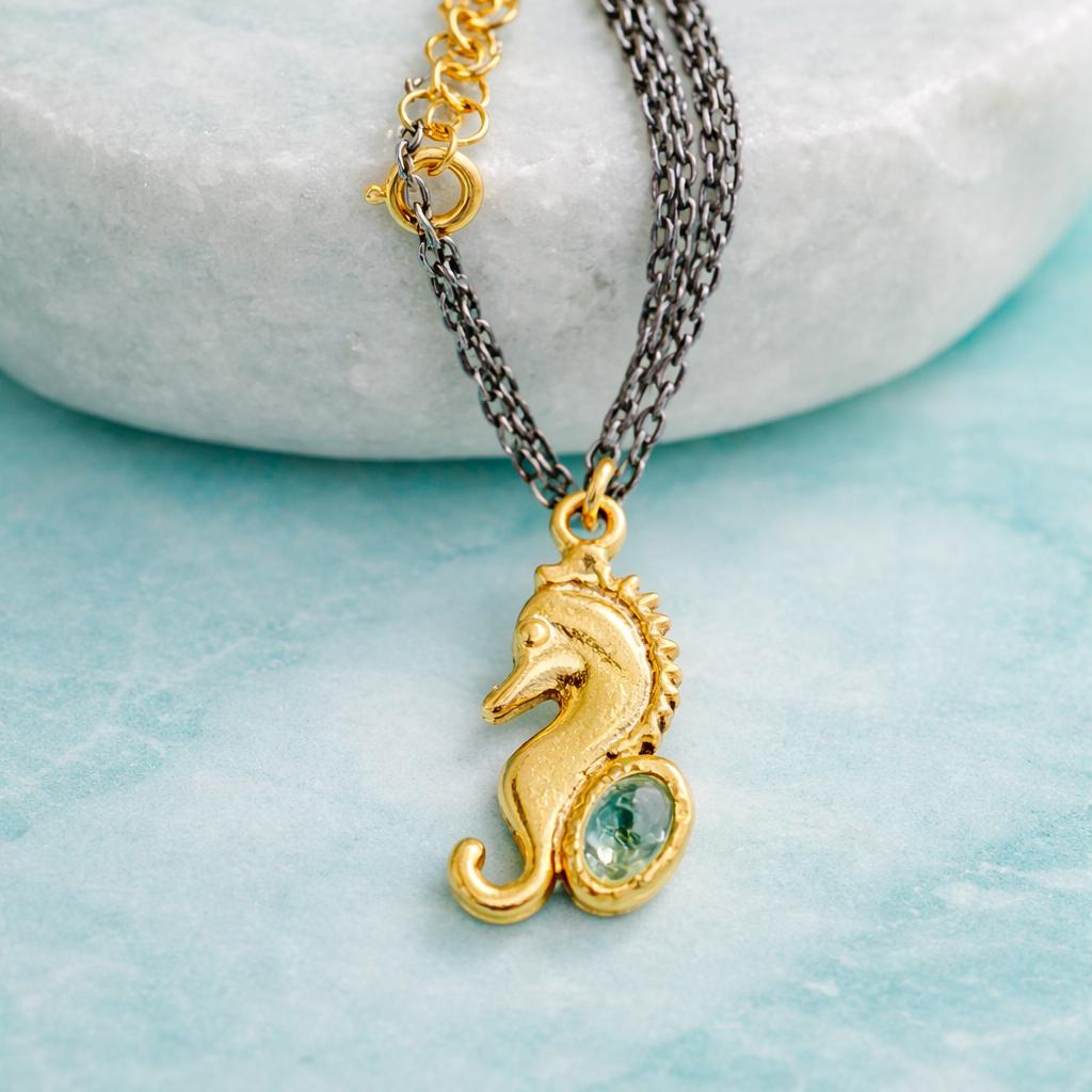 Crafted in sterling silver with gold-plated details, and finished with a delicate gemstone, this sea horse necklace is both meaningful and effortlessly elegant.