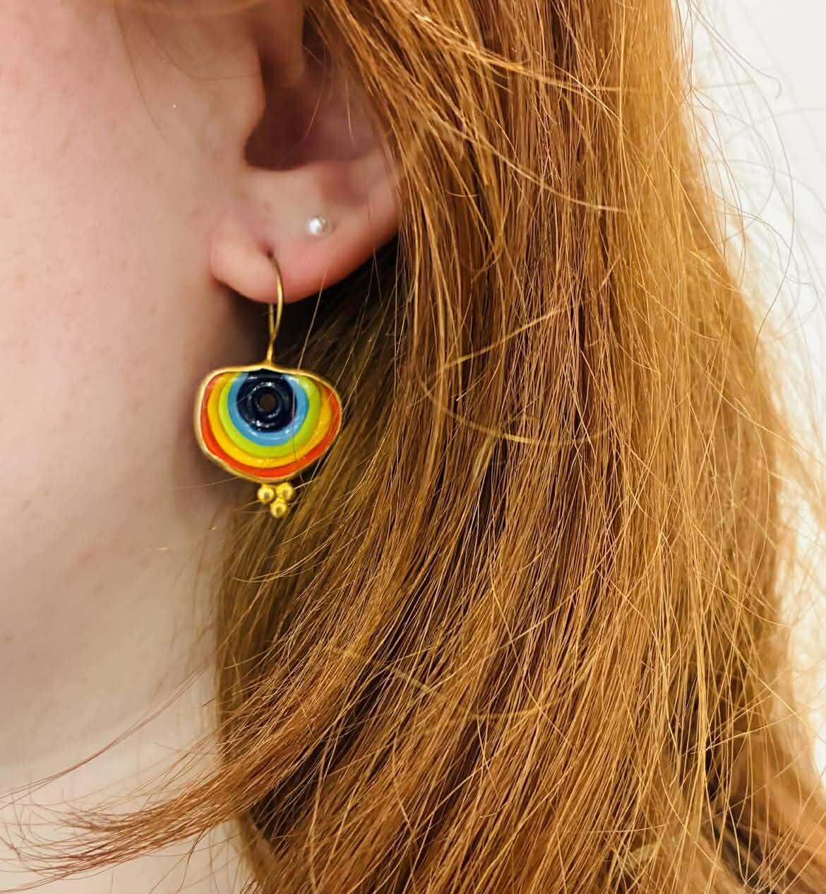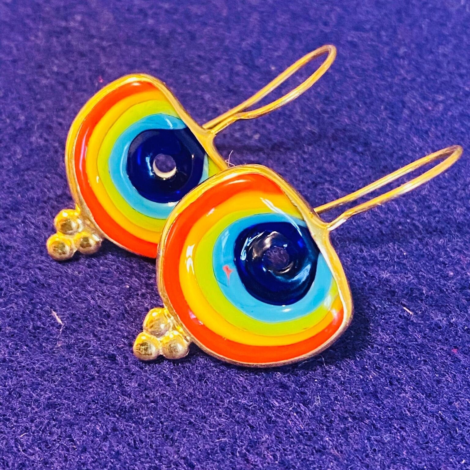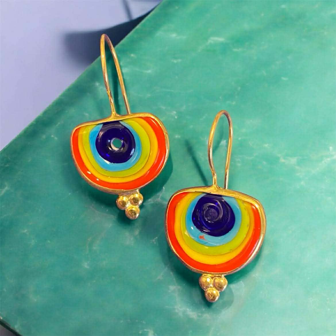 Presenting our Glass Rainbow Gold Plated Silver Handmade Earrings – a symbol of resilience and beauty. Just like a rainbow that appears after the storm, these stunning dangle earrings feature hand-blown glass beads in vibrant rainbow hues, encased in shimmering gold-plated silver. Lightweight and unique, they're perfect for any occasion. Elevate your style with these one-of-a-kind, handcrafted earrings that remind us of the beauty that emerges after going through difficult times. Discover the magic of artisanal beauty today.